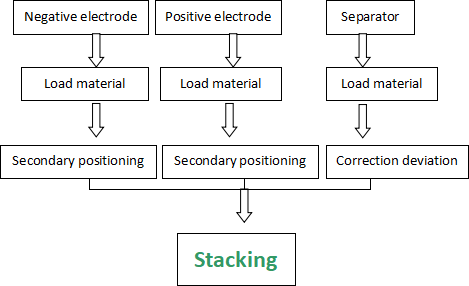 장비의 좌우 조작기 메커니즘은 양극 및 음극 재료 슬롯에서 전극판을 집어 올리고, 2차 위치 조정 작업대에 의해 정밀하게 위치를 조정한 후, 스태킹 플랫폼에서 재료를 번갈아 배치합니다. 스태킹 플랫폼은 두 조작기 와 함께 좌우로 움직이며 , 양극 및 음극 전극판을 분리하는 Z자 모양의 분리 필름을 형성합니다. 이런 식으로 장치가 순환하여 전극 그룹 의 스태킹 조립을 달성합니다 .