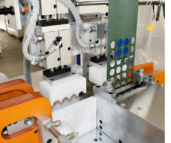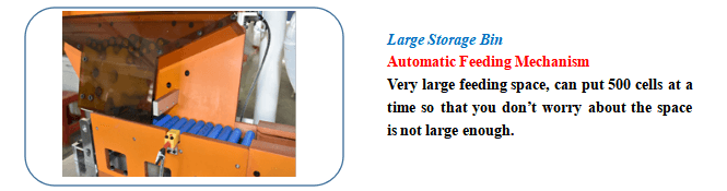 배터리 상자 전체 채우기 → 모터 회전 → 실린더가 배터리를 밀어냄 → 벨트 운반 배터리 → 배터리 발사 → 배터리가 컨베이어 벨트에 들어감 → 실린더가 해제됨 → 리드 스크류가 실린더 배터리 팀을 구동 → 배터리가 배터리를 이동시키기 위한 4개의 리드 스크류로 가득 찼음 → 실린더 압력 하에서 → 배터리를 고지대 보리 종이 위치로 이동 → 실린더를 배터리에 2차 위치 지정 → 스테퍼 모터에 보리 종이 붙이기 → 폐기물 회수 → 완성된 배터리를 배출 슈트로 → 실린더가 배터리를 분류 벨트로 밀어냄 → 배터리 발사 → 배터리 테스트 → 배터리가 가득 찬 후 조작기 가 배터리를 잡음 → 배터리 분류 → 수동 포장