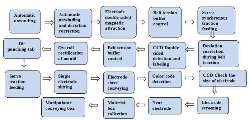 * 이중 CCD 검출 및 전극 표면 결함 라벨링 (CCD가 전극 의 양면을 검출하고 , 라벨링 기계가 검출 후 불합격 제품에 라벨을 붙이고, 극 귀가 형성되면 이 부분을 통과시킵니다. 이 장비에는 기본적으로 이 기능이 없으며 설치 위치는 예약되어 있습니다.) 이 기능은 선택 사항입니다.