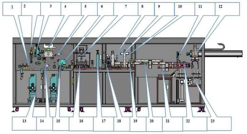 15 | Labeling mechanism | Label cutting and labeling mechanism; The labeling speed matches the pulling speed, and the labeling machine is located at the tab |