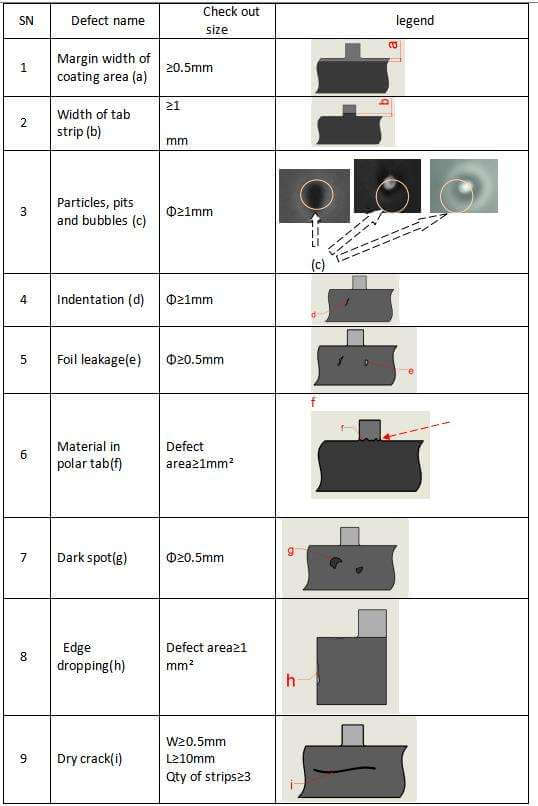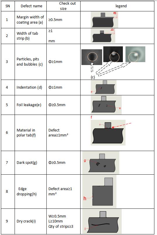 12 | CCD Test items | Coating defects of standard lithium battery pole pieces such as exposed foil, dry material, dark spots, scratches, foreign matters, etc |