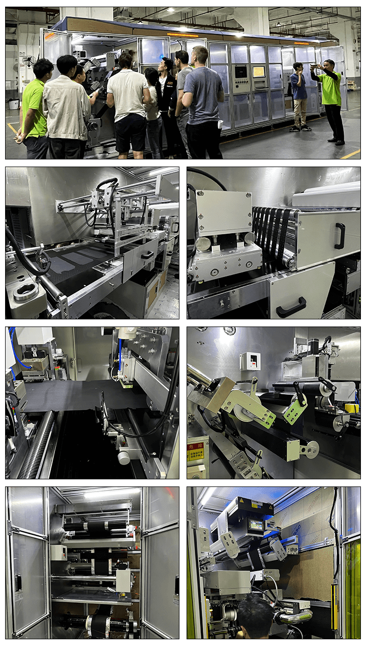 라벨링 기계 세트를 장착하여, 부착 속도는 절단 속도와 일치하며, 라벨링 중심선과 극 조각의 내부 가장자리 거리를 조정할 수 있으며 정확도는 ± 2mm입니다.