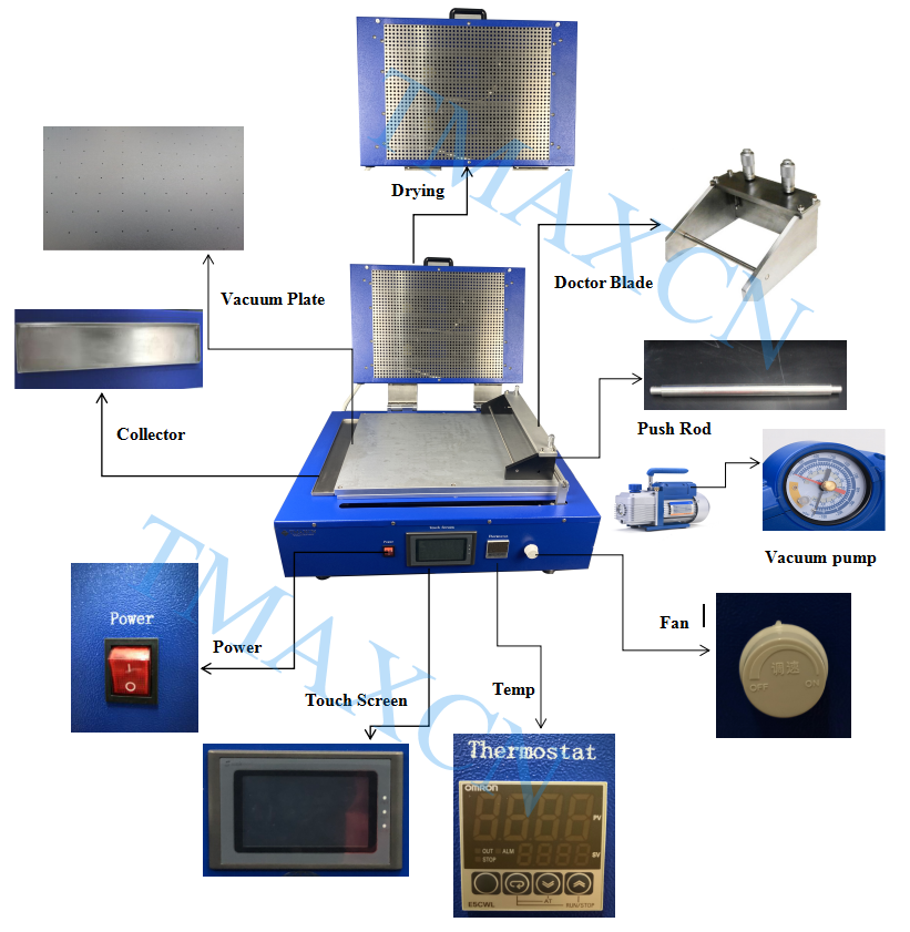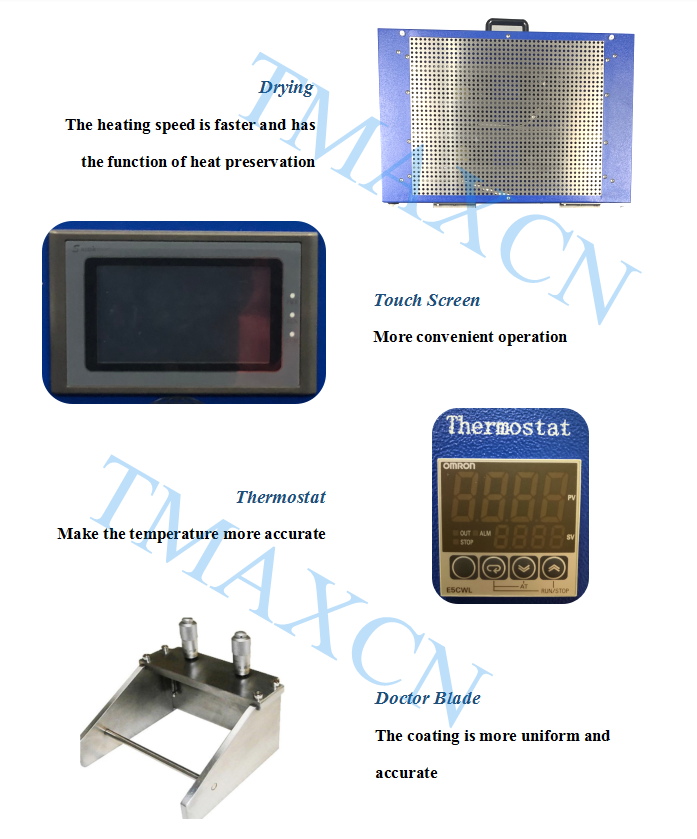 운영 절차 | 1. 전극을 진공판 위에 놓고 전원을 켜고 진공을 열면 전극이 진공판에 흡착됩니다. 2. 필름 도포기를 전극 위에 놓고 코팅 슬러리를 첨가합니다. 3. 필름을 열면 필름 장치가 자동으로 필름 도포기를 밀어서 이동하고, 자동으로 필름을 도포합니다. 4. 필름 도포기와 푸시로드를 꺼내고, 가열캡을 씌운 후 가열온도와 시간을 설정하고 가열하여 건조합니다. 5. 건조 후 방열판을 열고 코팅된 필름 전극을 꺼내면 필름 장치 재설정이 완료됩니다. | |||||