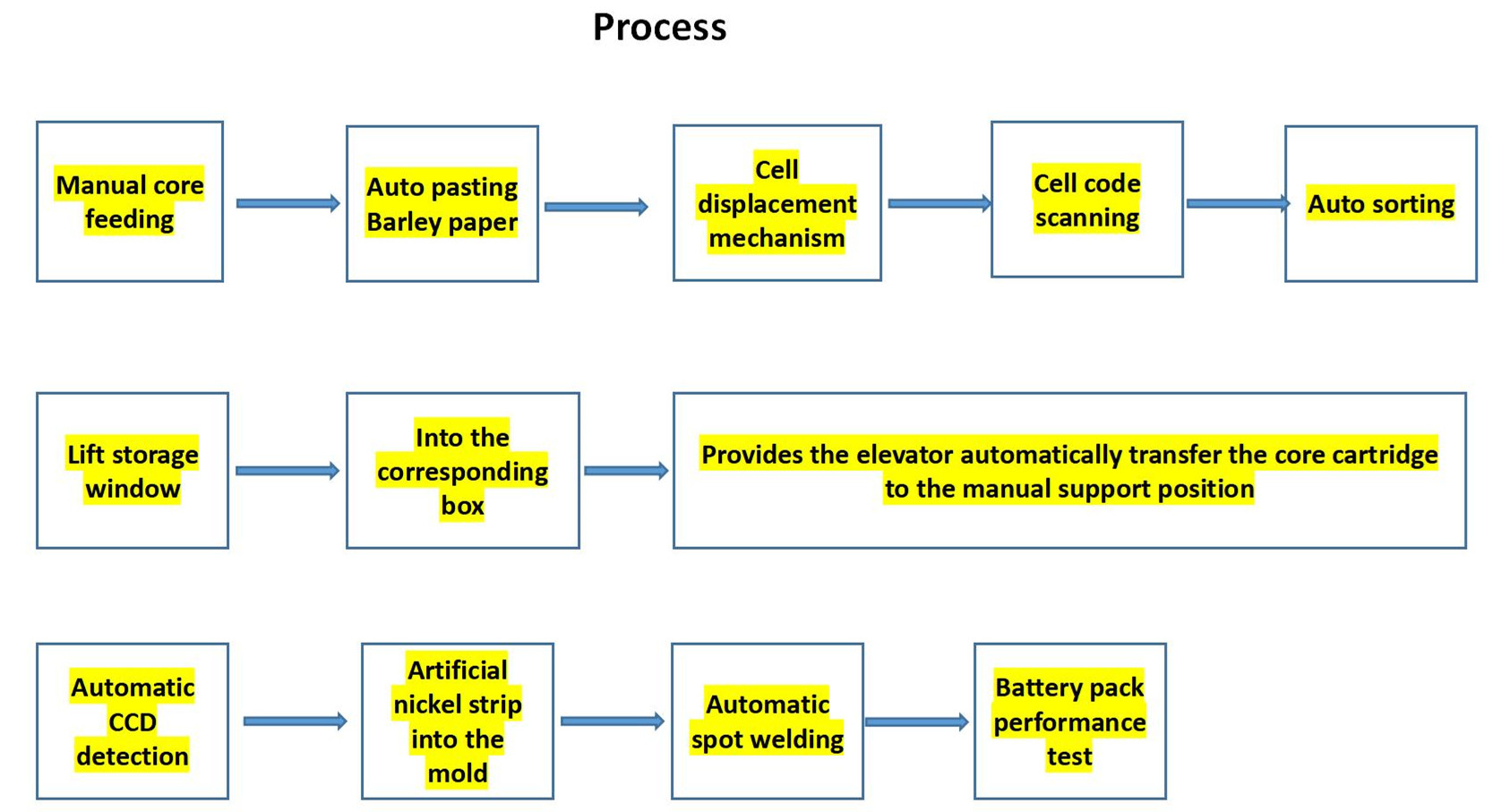 | 자동 리프팅 테이블 코어박스는 벨트롤러를 통해 자동리프트로 들어가며 이중 조립 라인의 상부 유출로 상승 2중 조립 라인 상단 조립 라인은 적재된 상자로 흐릅니다. 핵심과 함께 전체 상자가 수동으로 제거됩니다. 브라켓과 니켈 칩의 배치를 완료합니다. 금형에 코어를 넣다 |