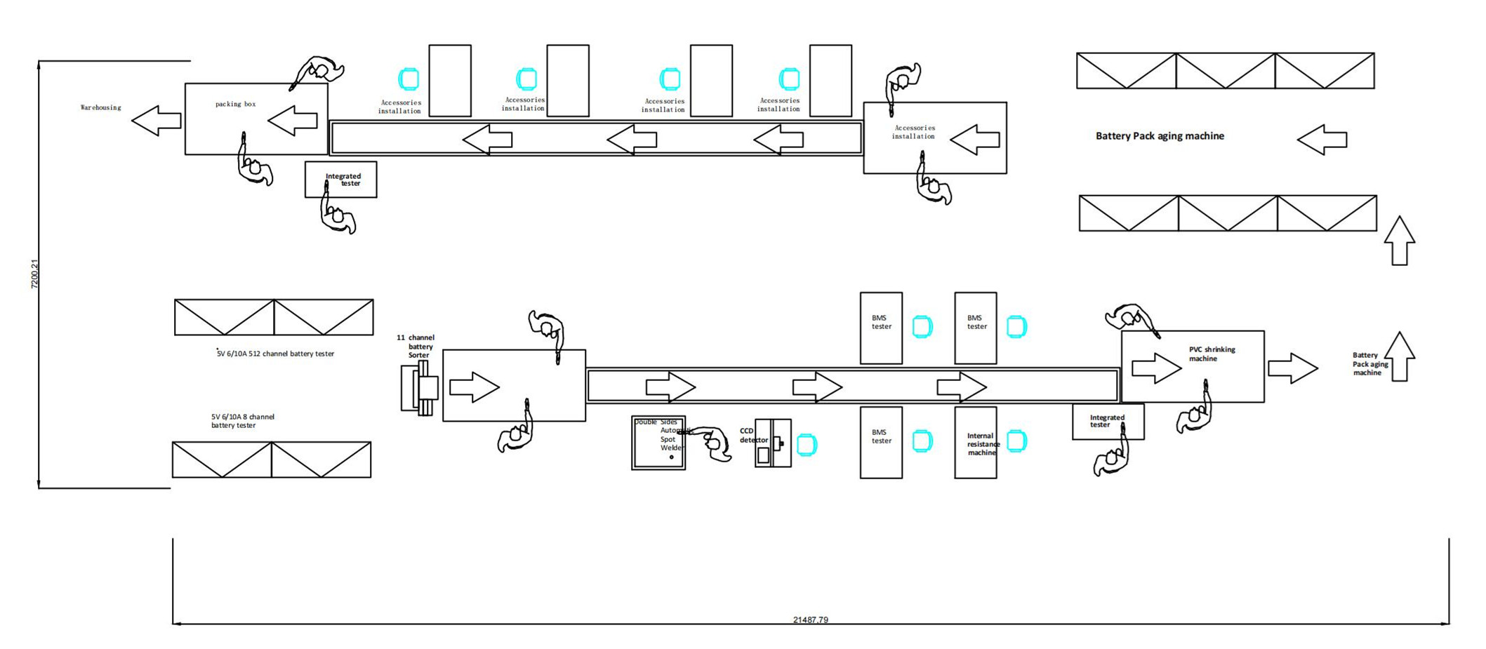 | 상층 조립 라인: L1500MM 벨트 폭 400MM, 전송 속도 1-3m/min 전송 전력: 25W 감속 모터, 2MM 녹색 PVC 벨트 주요 기능 : 빈 고무 상자를 자동으로 연결합니다. 엘리베이터 하위 계층 조립 라인: L5000MM 벨트 폭 400MM, 전송 속도 1-5m/min 변속 전력: 180W 감속 모터, 2MM 녹색 PVC 벨트 주요 기능 : 백엔드에서 아이템 전송 |